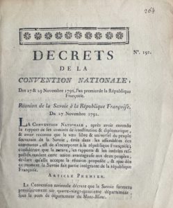 — Décrets de la Convention nationale, des 27 & 29 novembre 1792 [...]. Réunion de la Savoie à la République françoise. Du 27 novembre 1792. À Grenoble, chez J. M. Cuchet, [1792]. In-4, en feuilles.