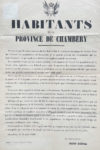 — Serra (Orso). [Sans titre]. Chambéry, imprimerie Puthod fils, [1860]. Placard in-plano, une marge effrangée. Vignette gravée sur bois aux armes de Savoie. En qualité de gouverneur de la province de Chambéry, le marquis Serra annonce le 10 mars 1860 aux habitants de la province de Chambéry la tenue du plébiscite : « Vous serez alors appelés à choisir entre cette ancienne monarchie de Savoie, à laquelle vous unissent une affection séculaire et un dévouement sans bornes, et la nation qui a tant de titres à vos sympathies, soit à raison de son voisinage, soit à raison de bienfaits récents ».