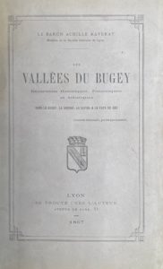- RAVERAT (Baron Achile). Les Vallées du Bugey. Lyon, chez l’auteur, 1867. Deux volumes in-8°, bradel demi-percaline bleue avec coins, tête dorée, couverture (Reliure moderne). Avec carte dépliante. Bon exemplaire.