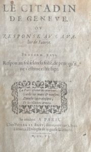 - [SARASIN (Jean)]. Le Citadin de Genève, ou réponse au Cavalier de Savoye. Paris, Pierre Le Bret, 1606 [XVIIIe siècle]. In-8, bradel demi-vélin ivoire, non rogné (Reliure de la fin du XIXe siècle). Réimpression du même ouvrage faite au XVIIIe siècle.