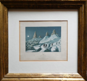 4 lithographies en couleurs selon le procédé Baxter, chacune encadrée, avec le timbre sec de Baxter en marge avec le titre de la vue, (dimensions des images : 13,5 x 10,5 cm). Premier tirage des vues destinées à illustrer l’ascension du Mont-Blanc par Macgregor en septembre 1853, à l’occasion de l’inauguration du premier refuge des Grands Mulets, en présence d’Albert Smith. Les vues représentent : 1) The glacier du Taconnay 2) Leaving the Grands Mulets 3) The steep and deep precipice of the Mur de la Côte 4) The summit.