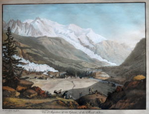 Genève, chez J. A. Linck, vers 1805. Gravure au trait finement aquarellée par Jean-Antoine Link d'après un dessin de Hackert de 1780, encadrée, 50 x 38 cm (à vue), cadre doré. Bonne épreuve de cette superbe vue du glacier d'Argentière, de la vallée de Chamonix, du glacier des Bossons et du Mont-Blanc, dont la version originale a été produite par Hackert en 1780. Discrète trace de mouillure en haut à gauche.
