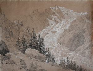 Genève, vers 1800. Dessin à la mine de graphite, estompe et craie blanche, signé à l'encre en bas à droite, titrée au dos, en feuille sur papier beige, 55 x 41,5 cm. Superbe dessin original, de très grand format, représentant le versant italien du Mont-Blanc. La cascade de séracs du glacier de la Brenva est magnifiquement rendue grâce aux rehauts de craie blanche. On y voit tout le déroulé de l'arête de Peuterey. La vue est dessinée depuis les pentes nord du Mont Chétif, sur le chemin d'accès au sanctuaire de Notre-Dame de Guérison. Un dessin comparable est conservé dans la collection Payot. Peyrot reproduit un dessin similaire.