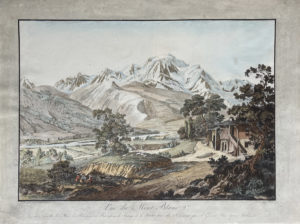 LINCK (Jean-Philippe) — Vue du Mont-Blanc 2ème. des Aiguilles du Midi, des Blaitières, du Bionassay, du Passage de la Forclaz pour aller à Chamonix par St Gervais, prise depuis Sallanches.