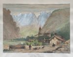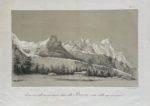 - William LINTON : Vue de Cormayeur (Valley of Aosta), Mont Blanc in the distance, lithographiée par William Day à Londres, coloriée et gouachée, extraite de Sketches in Italy during a tour in 1828-29, 1832 (dimensions de l'image : 32,5 x 24 cm). Peyrot I - 188/4.
