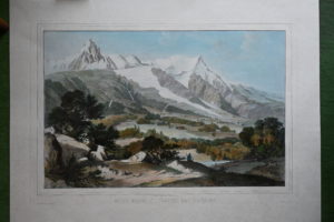 Paris, Wild, 1860. Lithographie coloriée et gommée, dessinée et gravée par Terry, imprimée par Lemercier, en feuille (dimension de l'image : 57,5 x 37 cm). Superbe et grande estampe, où l'on peut voir l'Aiguille du Midi, le Mont-Blanc du Tacul, le Mont Maudit et le Mont Blanc. Rare et belle épreuve.