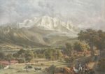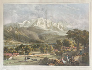 s. l., [1824]. Grande lithographie aquarellée, sur chine monté, 55 x 40 cm (taille de l'image). Belle épreuve avant la lettre de cette spectaculaire vue du Mont-Blanc depuis Sallanches, dessinée par Villeneuve et gravée par Godefroy Engelmann, et rehaussée à l'époque. Les personnages sont dus à Victor Adam. Petite déchirure en marge et rousseurs sur le papier support, restaurations. La gravure a paru avant la publication du tome 4 des Lettres sur la Suisse (1827), qui comprend une vue analogue mais de moins grandes dimensions.