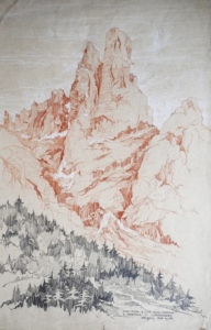 Dessin original, mine de graphite, fusain et rehauts de gouache, sur une feuille de papier beige (41 x 62 cm). Superbe dessin en 3 couleurs du Saas Maor et de la Cima della Madona, dans les Dolomites, dans les Pale di San Martino. Très grand format. Signé et situé en bas à droite.