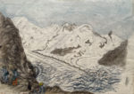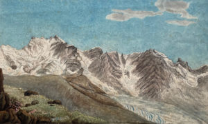 - Vue du passage de Saint Théodule vers le Cervin et le Breithorn, aquarelle originale contrecollée sur papier fort, réduite d'après le panorama dessiné le 28 juillet 1836 par Christian Moritz Engelhardt, 40,5 x 16 cm.