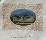 - Deux vues d'Aix-les-Bains et de son casino, gravures aquarellées de 6,5 x 4,3 cm, en ovale décoré d'un cadre de dentelle.