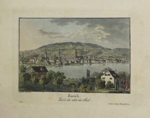 Zurich, Trachsler, vers 1820. In-12 oblong, reliure demi-basane avec coins, dos orné, pièce de titre. (Reliure de l'époque). Album de 22 vues des capitales des cantons suisses et de 24 planches de costumes, plus 2 planches de vues, gravées à l'aquatinte et coloriées à la main (48 planches au total). Très bel album de vues coloriées des principales villes suisses et des costumes de leurs habitants.