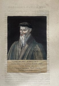 La Haye, ex officina B.C. Nieulandii, 1602. Eau-forte aquarellée (coloris postérieur). Ce portrait du réformateur Guillaume Farel est tiré de l'ouvrage de Jacob Verheiden : Præstantium aliquot Theologorum, qui Rom. Antichristum præcipuè oppugnarunt, Effigies, publié en 1602 à la Haye. Il est gravé au verso de la page 116, qui est ornée d'une belle lettrine coloriée. Parfait état.