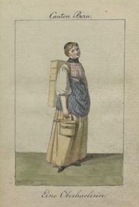 Zurich, Orell, Fussli & Cie,1811. In-16, reliure demi-chagrin rouge, plats d'origine recouverts de papier rouge maroquiné conservés, dos lisse orné, tranches dorées (Reliure moderne.). Rare édition bilingue français-allemand, ornée de 50 planches de costumes suisses en coloris d'époque, gravées d'après les dessins de Franz-Niklaus König.