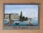 - ANONYME : L'île Rousseau (Genève), aquarelle et rehauts de gouache, 8 x 4,8 cm, XIXe siècle.