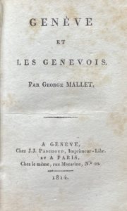 Genève, J.J. Paschoud, 1814. In-8, demi-chagrin violet, dos à nerfs, titre doré au dos (Reliure de l'époque). Édition originale. George Mallet (Genève 1787 – 1865) était un homme de lettres, député du Conseil de Genève et auditeur du Conseil d'État du canton de Genève. Quelques rousseurs.