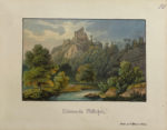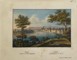 Bâle, Hasler & Cie, s.d. [v. 1851]. In-8 oblong, cartonnage rose imprimé (Reliure de l'éditeur). Très rare album comprenant 24 lithographies soigneusement coloriées et gommées de vues de Bâle, Dornach, Angenstein, Pfeffingen, Delémont, La Reuchenette, Bienne et du val de Moutier dans le Jura bernois, légendées en allemand et en français. WorldCat n'en répertorie qu'un seul exemplaire, conservé à la Bodleian Library d'Oxford.