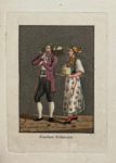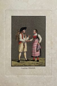 Zurich, Trachsler, s.d. [vers 1816]. In-8 carré, cartonnage flammé (Reliure de l'époque). Édition originale, rare. Jolie suite d'un titre gravé et 21 aquatintes coloriées de couples en costumes traditionnels des cantons helvètes, gravés d'après les dessins de Johann Martin Usteri. Ex-libris manuscrit de 1817. Des éditions postérieures (vers 1820) ont compté jusqu'à 24 planches, mais l'exemplaire de la bibliothèque de l'école polytechnique de Zurich et celui présentée par Interlibrum en 1994 possèdent bien 21 planches.