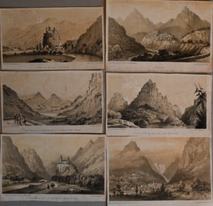 Londres, 1843. Environ 17 x 11,5 cm. 10 lithographies (sur 16) extraites du rare ouvrage "The Pyrenees, with excursions into Spain" : Bagnères de Bigorre, The town of Cauterets, Pic du Midi de Pau from Bios Artigues, Foix from the road of Toulouse, The ruined castle of Lordat on the road of Ax, Notre Dame de Pouy La Hunt in the valley of Azun, Hernani and the fortress of Santa Barbara (Spain), The fort and light-house of St Sebastian Spain, The covent of Miltzarran in the valley of Arran Catalonia, Ourgunzun Castle and town in Spain.