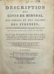 Paris et Strasbourg, Didot l'aîné, Cuchet et Treuttel, 1786. 2 parties en 1 volume in-4°, reliure pleine basane marbrée, dos à nerfs orné, pièce de titre, tranches rougies (Reliure de l'époque). Édition originale, illustrée de 6 planches hors-texte dont 4 dépliantes en couleurs, et de 7 tableaux dépliants. Cet ouvrage forme le premier volume de la "Description des gîtes de minerai et bouches à feu de la France", publiée en 6 parties en 3 volumes. Très important ouvrage : un des 20 livres les plus rares des Pyrénées (Labarère).