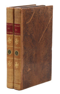 Paris, Bertrand, 1813. 2 volumes in-8, reliures plein veau marbré, dos lisse richement orné, pièces de titre et de tomaison, plats ornés d'un double encadrement de filets dorés, tranches marbrées (Reliure de l'époque). Édition originale. Le tome I est illustré d'un tableau dépliant et de deux cartes de Ramond dépliantes hors-texte. Le Tome II comprend 11 listes dépliantes et un tableau dépliant hors-texte. Important ouvrage sur les Pyrénées, sur les plans de la géologie, de la minéralogie, de la topographie, de l'économie, des traditions, et des points de vue pittoresques.