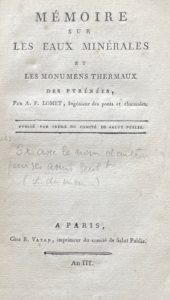 LOMET (Antoine François) — Mémoire sur les eaux minérales et les monumens thermaux des Pyrénées.