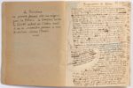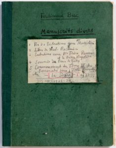 BAC Ferdinand (1859 - 1952) MANUSCRIT autographe signé « Ferdinand Bac », Manuscrits divers, 1932-1934; cahier vert à dos toilé petit in-4 (22,5 x 17 cm) d'environ 120 pages, sous chemise dos percaline noire et étui à dos toilé avec pièce de titre. Manuscrit de premier jet et de travail de ses souvenirs et récits de voyages. Le manuscrit, à l'encre noire, principalement au recto des feuillets du cahier, avec des additions sur la page en regard, et des pages insérées, est abondamment raturé et corrigé. Paginé 1-116, il porte, sur la couverture, une étiquette en donnant le contenu; à la fin du cahier, Bac a dressé un « Sommaire » avec renvois aux pages du cahier. En tête du cahier, Bac a noté: « A Caroline Octavie en souvenir de son compagnon de voyage. Ce cahier a été commencé le 8 Novembre 1932 aux Colombières à Menton avec une étude sur mon entrevue avec Mussolini » [Caroline-Octavie dite Jeanne Ladan- Bockairy, née Jouain, inspiratrice de F. Bac, protectrice, avec son mari Émile, de Bac, qui créa pour eux le jardin des Colombières dans leur propriété de Menton]; en regard, photographie de Mme Ladan-Bockairy. Le cahier commence par des Impressions de Rome (p. 1-3), fin de ses entretiens avec MUSSOLINI, « partiellement inédit », avec cette note en tête: « Le Fascisme ne pourra jamais être un régime pour la France. Le Français aime la liberté autant que l'Italien mais il ne se soumettra jamais à une Dictature comme l'Italie ». Suivent (p. 4-12) des notes sur des « Autographes inédits (concernant principalement Mad. Récamier », de la collection Caplain; puis des notes sur ses entretiens avec RENAN et avec TAINE, puis avec le Prince Napoléon en 1885-1888 (p. 12-50), destinées à ses mémoires (inédits). Après une « Introduction pour les Fables de La Fontaine » (mars 1934, 2 p.), des souvenirs intimes sur « Le Prince de Galles à la Turbie » en 1896 (p. 52-55). Commence alors (p. 56-116) le manuscrit du « III volume de la série Promenades dans l'Italie nouvelle. La Sicile ». Bac a monté à la fin un « échantillon d'une page “travaillée” et annulée » (page dactyl. surchargée de corrections et d'additions). Ex-libris au chiffre J B dessiné par F. Bac