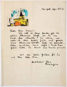FEININGER Lyonel (1871 - 1856) L.A.S. « Feininger », New York 14 avril 1941, à Mr Fabisch; 1 page in-4, vignette gravée et coloriée en tête; en allemand. Il remercie pour une coupe en aluminium: « Wie soll ich Ihnen danken für die schöne Alumium Schale die Sie mir durch Lux schenkten ? Wie wissen, wie schön ich Ihre Arbeit finde, und gerade diese Alumium Schale liebe ich besonders. Vielen, herzlichen Dank dafür ! »... La lettre est ornée en tête d'une gravure rehaussée à l'aquarelle