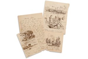 LUCE Maximilien (1858 - 1941) L.A.S. « Luce » avec DESSINS, Mercredi [vers 1917-1918], à SON FILS Frédéric LUCE; 2 pages in-4 sur un feuillet arraché d'un cahier, à la plume et encre brune (22 x 17 cm). Lettre illustrée à son fils. Il est allé voir BONNARD qui va bien: « J'ai fait plusieurs études avec lui. MATISSE est venu aujourd'hui avec deux amateurs qui m'ont acheté deux études de Bretagne 25 francs chaque, cela est un bon prix car c'était des choses que je vendais entre 100 et 120 »... Il est allé chercher des toiles à Lagny: « La journée d'hier était très belle. J'ai revu avec plaisir la plaine de Lagny c'était magnifique »... Au verso, deux dessins à la plume et encre brune. Paysage, champ avec des meules de paille; scène avec un personnage (clochard ?) assis au premier plan, et au fond une femme s'avançant vers un comptoir. Luce note au bas de la feuille: « Pas fameux ma plume marchait mal et pas très en train »... On joint 2 feuilles de dessins avec notes autographes: - vue de ruines (14 x 16cm) annotée: « C'est encore une pâle idée de certaines photos de ruines »...; - 2 paysages superposés: arbres, et bord de rivière (18 x 11,5 cm), avec cette note: « Lebasque ouvre son exposition chez Petit. Je vais pas y aller à cause du mauvais temps »... Plus une L.A.S. d'Ambroisine Luce à son fils Frédéric