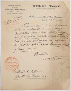 NADAR Félix Tournachon, dit (1820 - 1910) L.A.S. « Nadar », Paris 2 octobre 1870, à Paillard de Villeneuve de la Gazette des Tribunaux; 1 page in-4 à en-tête République Française, Défense Nationale 18e Arrondt, Observations aérostatiques sous la direction des Citoyens Nadar-Dartois- Duruof, cachet à l'encre rouge République Française, 1 Aérostiers Nadar-Dartois-Duruof. Siège de Paris. [Nadar a créé une Compagnie d'aérostiers pour la mise en place de la poste aérienne, depuis la butte Montmartre; il s'agit ici d'un des premiers vols qui quittent Paris.] « Prière à l'ami P. de Villeneuve et à sa rédaction de m'adresser leurs lettres pour hors Paris (conformément aux prescriptions postales) avant demain soir, vu que nous avons un départ de fort aerostat après demain matin 7 heures mardi »..