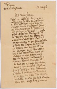 PISSARRO Camille (1830 - 1903) L.A.S. « C. Pissarro », « Rouen Hôtel d'Angleterre » 30 octobre 1896, à SA FEMME Julie; 2 pages in-8. Il évoque les tensions entre deux de leurs fils Georges et Lucien: « Il vaut mieux ne pas faire attention à toutes ces blagues là, aussitôt que Georges sera mieux il ira en Espagne ou à Barcelonne ou à Sn Sébastian, mais je crains bien que ce sera avec Dario [de REGOYOS] la même mésaventure qu'avec Théo [Van RYSSELBERGHE] à Bruxelles, il ne faut pas aggraver les choses, laisses ces histoires stupides. J'ai bientôt fini mes tableaux, j'espère à présent que DEPEAUX ne va pas me faire trop attendre sa visite, je n'ai que juste l'argent pour aller jusqu'aux premiers jours de la semaine prochaine. Je vais faire mes caisses et je les enverrai à Eragny ». Il doit se procurer une nouvelle seringue, la sienne s'étant cassée. « Voilà le temps au froid, le gros paletot, le jersey ne sont pas de trop »... [En 1896, Camille Pissarro effectue deux séjours à Rouen; il y réalisera notamment Les toits du vieux Rouen, temps gris. François Depeaux était un grand collectionneur rouennais.]