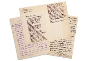 PISSARRO Camille (1830 - 1903) 3 L.A.S. « C.P. » (une incomplète du début, et 2 minutes dont une non signée), 1902 et s.d.; 5 pages et demie in-8. Ensemble concernant la propriété de ses parents à Saint-Thomas aux Antilles, et des problèmes de succession. L.A.S. à son beau-frère ISAACSON (mari de sa demi-soeur Esther), non datée (brouillon, encre violette). Il évoque un problème de dette de son père, remercie Isaacson de recevoir son fils Georges et enfin promet un portrait de sa fille pour Esther... Fin de L.A.S. à sa femme Julie. Il évoque l'affaire de la succession puis termine: « J'ai visité plusieurs marchands de gravures, j'ai encore une recommandation de Duret pour un autre, je cherche un représentant parmi ces messieurs, je ne suis pas encore décidé, j'y réfléchis »... Paris 28 place Dauphine 3 janvier 1902. Brouillon autographe à son neveu Alfred, concernant la succession et la vente de la propriété familiale de Saint-Thomas. « Quant à la demande que tu me fais d'aller à St Thomas et à nos frais pour mettre un peu d'ordre dans la gestation de la propriété, j'accepte avec empressement ta proposition sachant bien que je ne saurais avoir un meilleur et plus juste représentant de nos intérêts et j'espère que nos cohéritiers sauront profiter aussi de cette bonne occasion. Pendant que tu serais à St Thomas je te saurai grés, mon cher Alfred de me mettre au courant de la vente de St Thomas aux États-Unis et des conditions qui seront stipulées »..