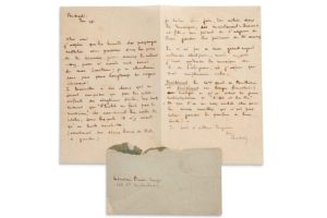 DEBUSSY Claude (1862 - 1918) L.A.S. « Claude », Vendredi [22] février 1895, à Pierre LOUŸS; 2 pages in-8, enveloppe. Belle lettre à son ami Pierre Louÿs. « J'espère que la beauté des paysages reflétée avec passion dans les yeux de tes diverses petites amies te retient assez, pour n'avoir nul souci de mon écriture; je ne chercherai donc pas plus longtemps de vagues excuses ! Je travaille à des choses qui ne seront comprises que par les petits-enfants du vingtième siècle; eux seuls verront que “l'habit ne fait pas le musicien”, ils arracheront les voiles des idoles, sous lesquels il n'y avait qu'un triste squelette (assentiment sur divers bancs du Ciel, à gauche). Je salue avec joie, ton entrée dans la Musique, dès maintenant. - Durand et fils - me prient de t'adjurer de leur garder la primeur de tes Oeuvres. Je n'ai pu à mon grand regret entendre Chilpéric, mais ce, soir j'irai entendre la musique de E. de Polignac, et j'espère que ceci remplacera cela. Décidément le 14me quat. de Beethoven est décidément une longue fumisterie ! malgré ce qu'en disent les jeunes métaphysiciens de l'Art et la Vie - Et que l'on ne nous embête plus avec les vieux meubles qui n'ont pas même gardé le parfum de leur siècle ! »... Correspondance, 1895-7