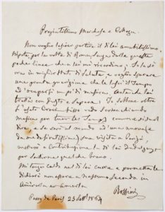 ROSSINI Gioacchino (1792 - 1868) L.A.S. « Rossini », Passy de Paris 25 septembre 1864, au marquis Domenico CAPRANICA, « Celebre Compositore Dilettante di Musica »; 1 page in-4, adresse (2 petites taches); en italien. Il ne laissera pas partir pour Rome le neveu de Capranica sans ces quelques lignes. Il espère le marquis en meilleure santé et qu'une rapide guérison lui laissera du temps pour s'occuper de musique (« ad'occuparsi un po di musica »). Quant à lui, il écrit de la musique pour tuer le temps comme on dit (« vado scrivere chi ando musica per tuer les temps comme si vuol dire). Il espère, s'il est encore de ce monde à la prochaine visite, si vivement désirée, du marquis à Paris mettre à contribution son indulgence pour entendre une de ses compositions (« mettere a contribuzione la di lei indulgenza per sentirme qualche brano »)..