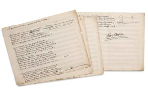 COCTEAU Jean (1889 - 1963) MANUSCRIT autographe signé « Jean Cocteau », Le petit prince est assis à la terrasse du Fouquet's bar, [1910 ?]; 4 pages oblong in-fol. (27 x 35 cm) de papier musique. Long poème de jeunesse. Ce poème, de 13 sizains, a été publié dans la revue Comoedia le 12 juin 1910; il n'a pas été retenu dans Le Prince frivole (Mercure de France, 1910). « Le soir est violet et mou comme une figue L'oisiveté m'emplit d'une aimable fatigue Je confonds la nature et l'artificiel »... Le manuscrit est curieusement rédigé sur des feuillets de papier à musique, à l'encre noire; il présente de nombreuses ratures et corrections, et d'importantes variantes avec le texte publié. Ainsi une nouvelle version des trois premiers vers cités ci-dessus est notée en marge; c'est celle qui sera retenue pour la publication. Les deux dernières strophes sont très différentes de celles publiées. Oeuvres poétiques complètes (Pléiade), p. 1476-1478
