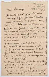 COCTEAU Jean (1889 - 1963) L.A. signée d'une étoile, [19 ? avril1940], à Jean MARAIS; 1 page petit in-fol. arrachée d'un bloc de dessin. Lettre fiévreuse à la veille d'une première. [La lettre a probablement été écrite le soir de la générale ou la veille de la première, le 20 avril 1940 au théâtre des Bouffes- Parisiens, de deux pièces de Cocteau: Le Bel Indifférent, pièce en un acte (monologue) avec Édith PIAF et Paul Meurisse, et Les Monstres sacrés avec Yvonne de Bray et Madeleine Robinson; décors de Christian Bérard.] « Mon bon ange Je rentre crevé. [...] Journée terrible avec des machinistes grotesques. Décor pas fini - Bébé fou de de désespoir etc... Robinson n'a pas été bonne ce soir et empêchait le jeu d'Yvonne - elle rendait la pièce et le rôle incompréhensibles. J'espère qu'il y aura un miracle demain. Piaf et Meurisse sont prodigieux - mais tous les bruits et les lumières restent à régler. La fin de l'acte est mauvaise. Il faut que je trouve un coup de génie demain. Sinon cela retombe, ce qui est dommage étant donné l'effet total »... Il meurt de crainte pour son Jeannot mobilisé: « Toi-toi-toi - rien que toi et te faire jouer avec Piaf - c'est mon rêve. Je te bénis. Fais une prière que le miracle arrive demain »