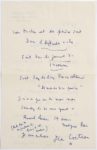 COCTEAU Jean (1889 - 1963) L.A.S. « Jean Cocteau », Santo-Sospir 11 septembre 1957, à Jacques LEPAGE; 2 pages in-8 à en-tête “Santo-Sospir, St Jean Cap-Ferrat. « Hélas je n'ai aucun poème inédit - mais tous le sont - car vous le savez, peu de personnes sont capables de reconnaitre un poème ». Accablé de travail, il ne peut promettre d'écrire les phrases demandées: « Ne pourriez-vous tricher et les prendre soit dans la Difficulté d'être soit dans le Journal d'un inconnu, soit dans le livre franco-allemand “Démarche d'un poète” », pour lequel il peut s'adresser de sa part à Raoul Leven..