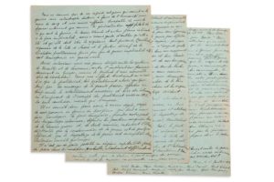 ELUARD Paul (1895 - 1952) MANUSCRIT autographe signé « Paul Eluard », Paris 18 juillet 1932; 3 pages in-4 sur papier bleu. Manifeste politique, marquant le ralliement d'une partie du groupe surréaliste au communisme, à la révolution soviétique. Malgré les fléaux qu'elle engendre, il ne faut pas oublier que la guerre « a été et qu'elle doit être le régisseur tout puissant, l'accélérateur vigoureux de la lutte des classes et le facteur décisif de la Révolution prolétarienne, pour peu que de guerre impérialiste elle soit transformée en guerre civile » Les signataires appellent à une guerre contre l'impérialisme français, où le prolétariat s'inspirerait de l'exemple russe en 1917. Ils ne sont pas pacifistes: « Il n'est pas de paix possible en régime capitaliste » où on se prépare à la guerre, d'abord contre l'U.R.S.S.: « Agressée ou non, l'U.R.S.S., seule nation qui puisse parler de la paix sans hypocrisie, peut être amenée d'un jour à l'autre, à faire la guerre pour défendre les conquêtes socialistes ». Et ils seront aux côtés de l'Armée rouge. À la veille de l'ouverture du Congrès de tous les Partis contre la guerre, ils s'élèvent contre Henri Barbusse et Romain Rolland qui condamnent la guerre; et contre les socialistes « Vandervelde, Adler, Renaudel, Breitscheid et consorts qui ont si honteusement trahi le prolétariat en 1914 et qui, depuis, se sont acharnés à vouloir sauver la capitalisme, à briser la lutte des classes et les révolutions. Pas d'Union sacrée du prolétariat révolutionnaire avec les chefs traîtres de l'Internationale socialiste et le Fédération syndicale d'Amsterdam. [...]. Un front unique ne pourra être réalisé que lorsque auront été démasqués » tous ces imposteurs. Ils veulent faire entendre leurs idées à Genève, mais les partis communistes ne sont pas suffisamment organisés. C'est pourquoi ils font appel à « l'Internationale des Écrivains Révolutionnaires pour être mandatés à ce congrès par sa section française où nous comprenons mal que nous ne puissions figurer au même titre que “les sept surréalistes (?) qui, dit notre camarade Vaillant- Couturier, sont déjà accueillis dans la section littéraire” et, à plus forte raison, que “l'idéaliste attiré par la puissance du rayonnement du marxisme (!!) qui figure dans la section philosophique”. Vive la lutte révolutionnaire du prolétariat contre la guerre impérialiste ! Vive l'alliance de la Révolution russe victorieuse et des ouvriers français contre l'impérialisme occidental ! » Suivent les noms des signataires: à côté d'Eluard lui-même, André Breton, Roger Caillois, René Char, René Crevel, Jules- Michel Monnerot, Benjamin Péret, Guy Rosey, Yves Tanguy, André Thirion, Pierre Yoyotte