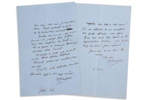 FLAUBERT Gustave (1821 - 1880) 2 L.A.S. « Gve Flaubert », [Paris février 1870, à son amie Jeanne de TOURBEY]; 1 page in8 chaque sur papier bleu. 4 heures [après le 12 février]. « Impossible, ma belle & chère amie ! J'ai une extinction de voix complète, une grippe affreuse - avec fièvre. Je me suis donné trop de mal pour la représentation de l'Odéon [au bénéfice du monument à Louis Bouilhet, le 12 février]. J'ai fait trop de courses ! Je suis exténué »... Jeudi 3 h. [17 février]. Il est malade et la remercie de sa sollicitude, mais il n'a besoin de rien: « Forget me serait inutile et les bonbons ne me serviraient pas ». Il voudrait la voir, mais ne le peut pas « parce que je suis hideux avec mon emplâtre sous l'oeil. Cela me forcera à manquer le mariage & le dîner du bon Troubat. Ma grippe se passe - & je me remets un peu de mon extrême lassitude ». Il viendra la voir dès qu'il pourra se montrer. « D'ici là, mille tendresses, ma chère belle amie tout à vous corps & âme »..