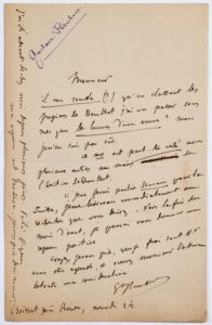 FLAUBERT Gustave (1821 - 1880) L.A.S. « Gve Flaubert », Croisset près Rouen mercredi 24 [juin 1874]; 1 page in-8. « Il me semble (?) qu'en classant les papiers de Bouilhet j'ai vu passer sous mes yeux les larmes d'une veuve ? mais je n'en suis pas sûr. Ce ms est peut-être resté avec plusieurs autres aux mains de l'héritier de Bouilhet. Si je ne devais partir demain pour la Suisse, je me livrerais immédiatement aux recherches que vous désirez »..