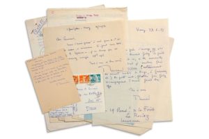 MORAND Paul (1888 - 1976) 19 L.A.S., 1952-1962, à André PARINAUD, et 2 TAPUSCRITS corrigés et signés; 19 pages formats divers, quelques enveloppes, et 5 pages in-4. Correspondance amicale et littéraire, concernant principalement sa collaboration à la revue La Parisienne, et à l'hebdomadaire Arts, dont Parinaud est le rédacteur en chef. Il lui apportera un texte: « De l'influence des prostituées françaises sur la civilisation et sa diffusion. C'est l'idée, sinon le titre » (XI.1952). Il demande à corriger les épreuves de ses textes, prépare une note sur Stendhal. Il suggère d'envoyer des numéros de la Parisienne à Armand Godoy qui a « des merveilles bibliophiliques dont je voudrais faire profiter la Parisienne » (juin 1953). 1954. Il remercie d'un article sur Hécate, « plein de justesse et de goût ». Beau texte sur La Toilette de la mariée de Courbet, exposée à Londres: « Sur toutes ces pages vierges, la mariée n'a pas encore écrit son destin »... Souvenirs de ses débuts scandaleux à la N.R.F.: « en 1922, avec mes premiers livres, scandale d'autant plus pittoresque que j'y étais le premier pauvre riche de droits d'auteur, au milieu de millionnaires pauvres (Gide, Schlumberger etc.) qui ne me l'ont pas plus pardonné que le reste de la rive gauche (ô oui, gauche) ». 1955. Sur l'Académie française: « J'aurais aimé être de l'Académie à 45 ans quand j'étais vieux. Après un quart de siècle, je suis jeune, débarrassé de toute contrainte, ayant échappé aux honneurs que j'ai toujours détesté, trop libre pour remettre sur ma tête un bicorne à cocarne coiffé pendant 32 ans. [...] Je ne réside plus en France depuis 1943. [...] Le statut d'étranger est vraiment le seul qui désormais, permette de vivre, et je ne suis pas près d'y renoncer »... 1956. sur la mort de Walter de la Mare: « C'est bcp plus important que T.S. Eliot. Claudel le tenait, non seulement pour un gd poète, mais pour le génie de l'uncanny (mystérieux sinistre) »; annonce du livre de Ginette Guitard-Auviste sur lui. 1957. Témoignage sur Paris-Presse, seul journal à réunir « une pareille équipe de chroniqueurs, d'écrivains, aussi vivnats, aussi doués, aussi ennemis du confort intellectuel et aussi heureusement imprudents »... Etc. Les deux tapuscrits, corrigés, sont: Retour à Marco Polo, sur les voyageurs, et Le travail, voilà l'ennemi ?. On joint une lettre expédie par ballon monté, Paris 27 décembre 1870, vers Cahors