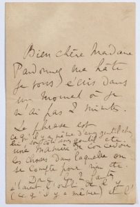 PROUST Marcel (1871 - 1922) L.A.S. « Marcel Proust », à une dame; 2 pages in-8 (traces de collage au dos du 2e feuillet). Leçon de style. Il répond à la hâte: « La phrase est ce qu'il y a même d'assez gentil chez lui, son côté assez gentil etc. une manière de concevoir les choses dans laquelle on se compte pour rien etc. Donc les 2 fautes étaient l'oubli de l'y (ce qu'il y a même) et l'oubli de on devant quoi où ne serait pas très euphonique. Dans laquelle est mieux. L'et qui précède est inutile (une manière etc dans laquelle on se compte) »..