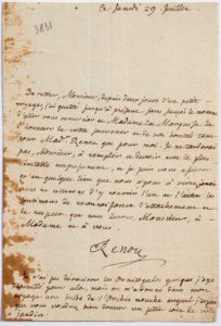 ROUSSEAU Jean-Jacques (1712 - 1778) L.A.S. « Renou », [Monquin] samedi 29 juillet [1769, au marquis de BEFFROY, gouverneur de Bourgoin]; 1 page in-8 (légères taches marginales sur un bord). [En août 1768, Rousseau, sous le pseudonyme de Renou, a trouvé refuge à Bourgoin; c'est là qu'il a épousé Thérèse Levasseur le 30 août.] « De retour [...] depuis deux jours d'un petit voyage, j'ai guetté jusqu'à présent sans succès le moment d'aller vous remercier et Madame la Marquise de l'honneur de votre souvenir et de vos bontés tant pour Made Renou que pour moi. Je ne tarderai pas, Monsieur, à remplir ce devoir avec le plus véritable empressement »... Le botaniste ajoute en post-scriptum: « Je n'ai pu déraciner les Ornitogales quoique j'aye travaillé pour cela, mais on m'a donné dans mon voyage une bulbe de l'Orchis mouche auquel j'espère que vous voudrez bien donner un petit coin de vôtre jardin »