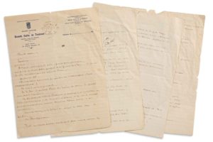SAINT-EXUPÉRY Antoine de (1900 - 1944) MANUSCRIT autographe, Chez le receleur, [vers 1927]; 4 pages sur 4 feuillets in-4 à en-tête des Grands Cafés de Toulouse. Plan d'un scénario inédit, avec 2 petits dessins. L'action, proche du roman policier noir, se passe dans un vieux manoir, en pleine campagne profonde. Un bandit est en fuite et son portrait dans les journaux; des inspecteurs sont à sa recherche, le préfet fulmine. Deux truands, H. et T., règlent leurs comptes. Le découpage donne de nombreuses indications de temps, de cadrage, de jeux d'acteurs, voire de montage. « Chez le receleur - journaux - 2° type qui jette sa cigarette et lit. Journal froissé par le vent. Une prime de 10.000 francs est offerte à qui fournira la retraite... Il semble qu'il se soit établi dans la région de Rouen... [...] Les marchands de journaux qui parlent en s'éloignant (idée d'éparpillement). 2° sous la pile de journaux. 3° les trois inspecteurs floués qui lisent et jettent le journal avec dépit (comique). 4° des joueurs de manille (grosse pile de soucoupes) à moustache ou barbe (petit boutiquier) qui discutent à grand coup sur le journal puis commandent une nouvelle tournée et chacun prend l'air vainqueur. 5° une concierge sur le trottoir qui discute là-dessus avec le facteur. 6° Pluie de journaux Toutes ces scènes vont en accélérant »... Etc