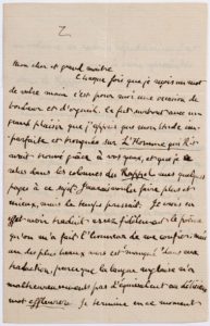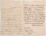 SWINBURNE Algernon Charles (1837 - 1909) L.A.S., Londres 29 avril 1870, à Victor HUGO; 2 pages in-8; en français. Belle lettre d'admiration littéraire et politique pour Victor Hugo. « Mon cher et grand maître Chaque fois que je reçois un mot de votre main c'est pour moi une occasion de bonheur et d'orgueil. Ce fut surtout avec un grand plaisir que j'appris que mon étude imparfaite et tronquée sur L'Homme qui rit avait trouvé grâce à vos yeux, et que je relus dans les colonnes du Rappel mes quelques phrases à ce sujet. J'aurais voulu faire plus et mieux, mais le temps pressait. Je crois en effet avoir traduit assez fidèlement le poëme qu'on m'a fait l'honneur de me confier; mais un des plus beaux vers est “manqué” dans ma traduction, parce que la langue anglaise n'a malheureusement pas d'équivalent au délicieux mot effleurer. Je termine en ce moment un volume de poésies républicaines dont quelques unes seront, je crois, reproduites dans le Rappel. C'est difficile, et surtout c'est audacieux, de tenter après vous ce chemin escarpé et sublime; mais peut-être y retrouveriez-vous, en me faisant traduire par une voix amie, quelques traces des études dont mon enfance s'est abreuvée. J'espère qu'un jour vous me permettrez de vous remercier à vive voix de tout ce que vous avez fait pour moi, comme pour le monde »..