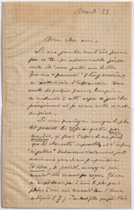 VERLAINE Paul (1844 - 1896) L.A.S. « PV », Mardi 23 [octobre 1888, probablement à Joris-Karl HUYSMANS]; 2 pages in-8 sur papier quadrillé (pli médian renforcé). Belle lettre de l'époque de la rue Royer-Collard, où Léon Bloy et Huysmans viennent en aide au poète. « Mon cher ami, Si ma jambe me l'eût permis par ces temps abominables j'eusse certes été vous porter une lettre que ma “pauvreté” (lisez misère) m'interdisait d'affranchir. Une vente de quelques pauvres bouquins m'enhardit à cette orgie ce jourdhui précisément où je reçois votre aimable missive. Si vous pouviez m'envoyer le plus tôt possible les 35 fr. en question par mandat, ça ferait l'affaire de mes pieds que des chaussettes impossibles et d'infâmes “ripatons” déshonorent vraiment et justement aux yeux de ma propriétaire. Et ideo, si possible, envoyez ça par mandat dès ce mot reçu. Ça ne m'empêcherait pas d'avoir le plus grand plaisir à vous voir mercredi dans l'heure indiquée (7) d'autant plus que j'ai l'air d'être un ingrat, après tous les excellents et gentils services que vous m'avez rendus, vous et le bon Bloy [...] À propos d'écriture, M. l'abbé Dewez m'a envoyé une lettre concernant Bloy que je n'ai pas jugé convenable d'envoyer à ce dernier, tant elle était... bête ! Et comme de juste, je n'y ai pas répondu. - On m'offre un lit à l'hôpital d'Aix-les-Bains. Mais c'est toujours la même affaire ! Voyages et règlement de comptes chez ma propriétaire qui me fait un nez long comme ça et des discours terribles dont je n'ai cure mais qui finissent par me faire tinter une cloche de bois... provisoire, terrible aussi ! “Qu'y faire ? Ah, laisser faire !” Broussais serait là, à la rigueur ! »... Il donne son adresse: « 14 r. Royer-Collard »