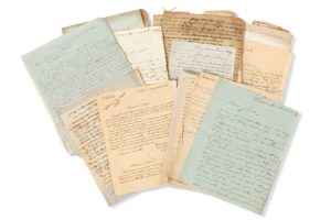 [Henri-Gatien, comte BERTRAND (1773 - 1844) général, grand-maréchal du Palais, compagnon de Napoléon à Sainte-Hélène.] Environ 80 lettres provenant de la Martinique ou relatives à la Martinique, adressées au général BERTRAND (quelques-unes à son fils Arthur), avec de nombreuses notes ou minutes autographes de réponse, 1827-1844. Intéressant dossier à propos du voyage et du séjour du général en Martinique ; la succession Dillon (famille de sa femme) ; l’économie de l’île et le mémoire du général Sur la détresse des colonies françaises ; l’écroulement de l’hôpital du Fort-Royal ; commissions et recommandations diverses, etc. Lettres de Constant d’Abzac, H. Beaufond (des Trois-Ilets), Billouin (de Bordeaux), Brière de Bretteville (Macouba), Brière de l’Île (Frégate), Dizac (avec poème sur Napoléon), M. d’Escoublant (Fond Moustique), M. de Fitz-James, P.C. Jouannet (poème sur Napoléon), H. de La Borderie (propriétaire à Pointe à Pitre), Emmanuel de Las Cases, Latuillier (du Lamantin), baron de Mackau (5), E. Martineau (Saint-Pierre), amiral de Mogel (gouverneur de la Martinique, 5), Jules Paulin, Pocquet de Luppé (Saint-Pierre), F. Rivière (Fort-Royal), vicomte de Rosily, Sinson Saint-Albin (Trinité), G.D. de Sanois (Saint-Pierre, invitation à présider une commission pour élever une statue à l’Impératrice Joséphine), Vidal de Lingendes (procureur général à la Martinique), vicomte de Villarson, etc.