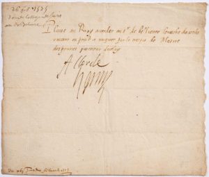 HENRI III (1551 - 1589) Roi de France P.S. avec un mot autographe « Accorde Henry », [26 février 1575]; demi-page oblong in-4. « Plaise au Roy accorder au sr de BELLIEVRE levesche de Senlis vaccant ou prest a vacquer par le trespas de Messire Desprunes possesseur diceluy »... Le Roi répond de sa main: « Accorde »..