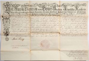 MARIE-THÉRÈSE (1717 - 1780) Impératrice P.S. « Maria Theresia », Vienne 20 avril 1778; in-plano (52 x 72 cm), grand en-tête gravé et orné Maria Theresia von Gottes Gnaden Römische Kayserin..., grand sceau aux armes sous papier; en allemand. Récompense militaire au chevalier Damian Joseph von DRECHSEL (1718-1791)