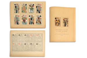 ENSEMBLE DE CARTES À JOUER - 1750 - XVIIIe siècle. Une carte au portrait de Paris, deux cartes auportrait de Guyenne mises en service à Bordeaux, une carte à points (huit de carreau) avec filigrne d'un jeu de l'époque - 1793. Jeu dit « de la Révolution », gravé sur bois, inventé par le comte de Saint-Simon et édité par Jaume & Dugourc en l'an II. Planche reproduite de 10 cartes figures. - 1672. Planche de 24 cartes françaises, épreuve tirée sur le bois original, appartenant à H.GARIEL, conservateur de la Bibliotheque de Grenoble. S'y ajoutent 8 cartes anciennes