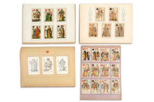 ENSEMBLE DE CARTES À JOUER - 1816. 5 Cartes d'un jeu dit « à la Fleur de Lys' » inventé et gravé par Jacques-Edouard Gatteaux. Les cartes représentent Lancelot en valet de trèfle, Argine en dame de trèfle, César en roi de carreau, Rachel en dame de carreau et David en roi de pique. - 1820. Jeu complet de 32 cartes avec enveloppe nommé « au Père de Famille » par Marcelin Villessauvés, cartier à Bordeaux. - 1814 à 1824. Jeu parfois appelé « du Duc de Berry » inventé par Gustave Houbigant, gravure sur bois par Hersent de Bergeret. 4 planches de 3 cartes chacune (Valet, Dame et Roi de chaque couleur) et deux tirages de 3 cartes chacune effectués sur papier filigrané au type « Fleur de Lys ». - 1816. Jeu parfois appelé « du Duc de Berry » inventé par Gustave Houbigant à l'occasion du mariage du Duc de Berry avec la Princesse Caroline de Naples, gravé sur cuivre. 4 planches de 3 cartes chacune (Valet, Dame et Roi de chaque couleur) et 20 cartes originales (dont 11 des 12 figures ainsi que l'as de Carreau porteur du filigrane)